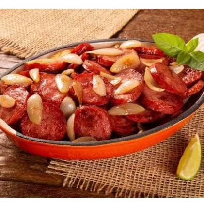 Linguiça calabresa grelhada, acompanha arroz, feijão, macarrão alho e óleo e batata frita