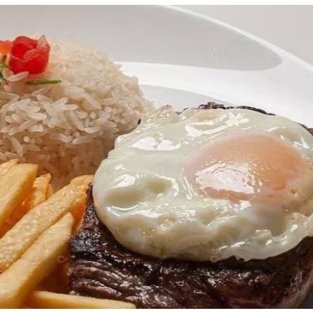 Servido em Marmitex de 500 ml,com bife de frango grelhado e um ovo frito, acompanha arroz, feijão, macarrão alho e óleo, batata frita