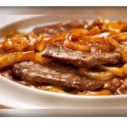 Marmita de 500 ml,com bife de pernil acebolado, acompanhado com arroz, feijão, legumes do dia, macarrão alho e óleo e batata frita