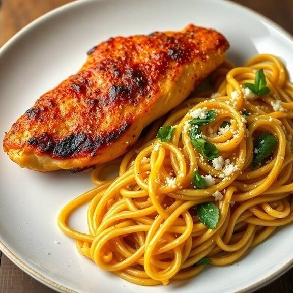 Experimente o macarrão ao alho e óleo: uma combinação perfeita de massa al dente envolta em um azeite aromático, salpicada com alho dourado e Acompanhado por um Filé De Frango Premium, com uma pitada de pimenta e salsinha fresca, irresistivelmente saboroso!