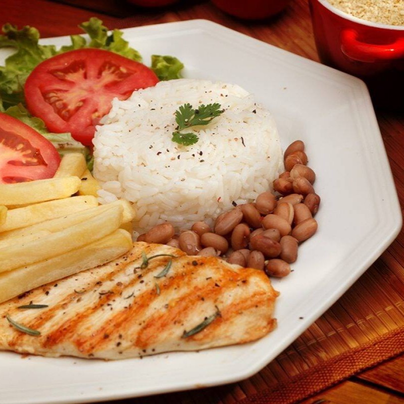 Filé De frango Bem suculento, Arroz branco bem soltinho, Feijão Carioca com Tempero Especial da casa, fritas bem crocante, farofa