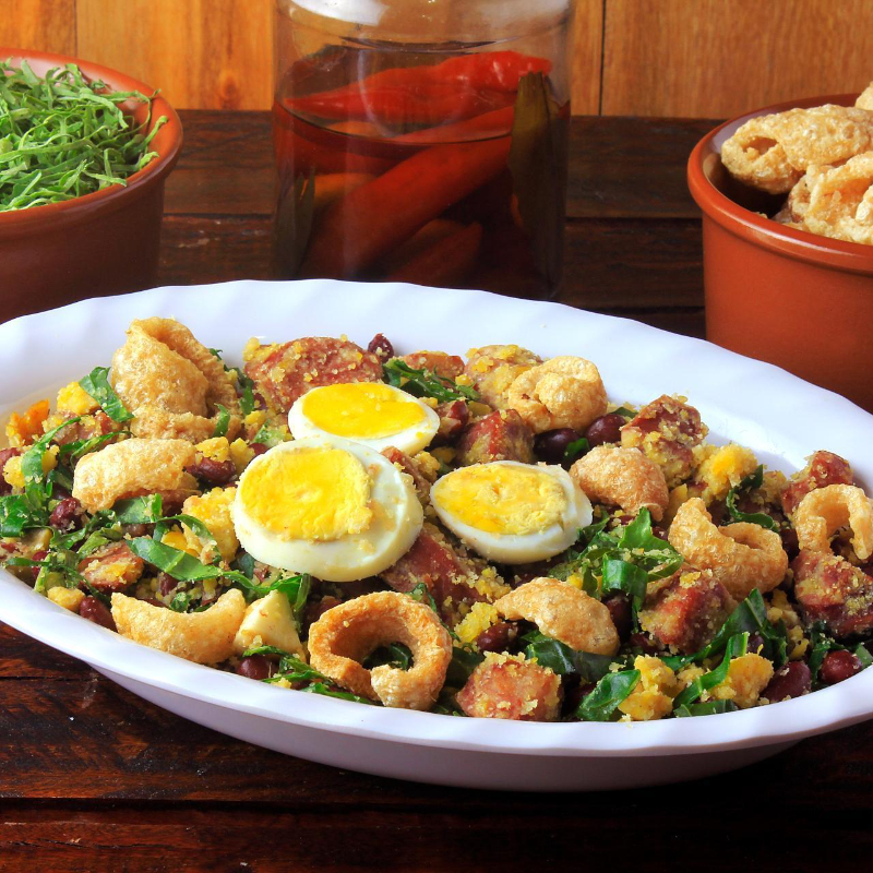 Uma deliciosa combinação de feijão tropeiro, bife de pernil suculento, couve refogada e um ovo frito . Uma explosão de sabores tradicionais .