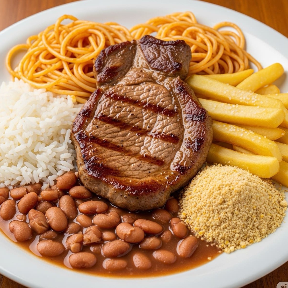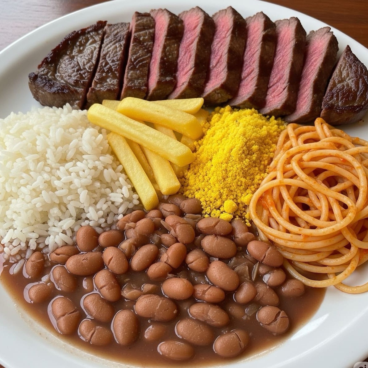 Arroz branco, feijão, batata frita, farofa, espaguete à bolonhesa e bife de boi (contra filé)
