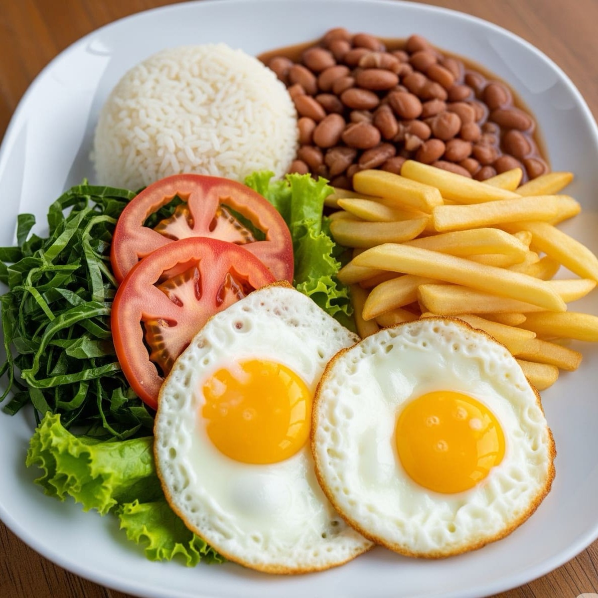 Arroz branco, feijão, batata frita, couve e 2 ovos. Salada de alface tomate separada.