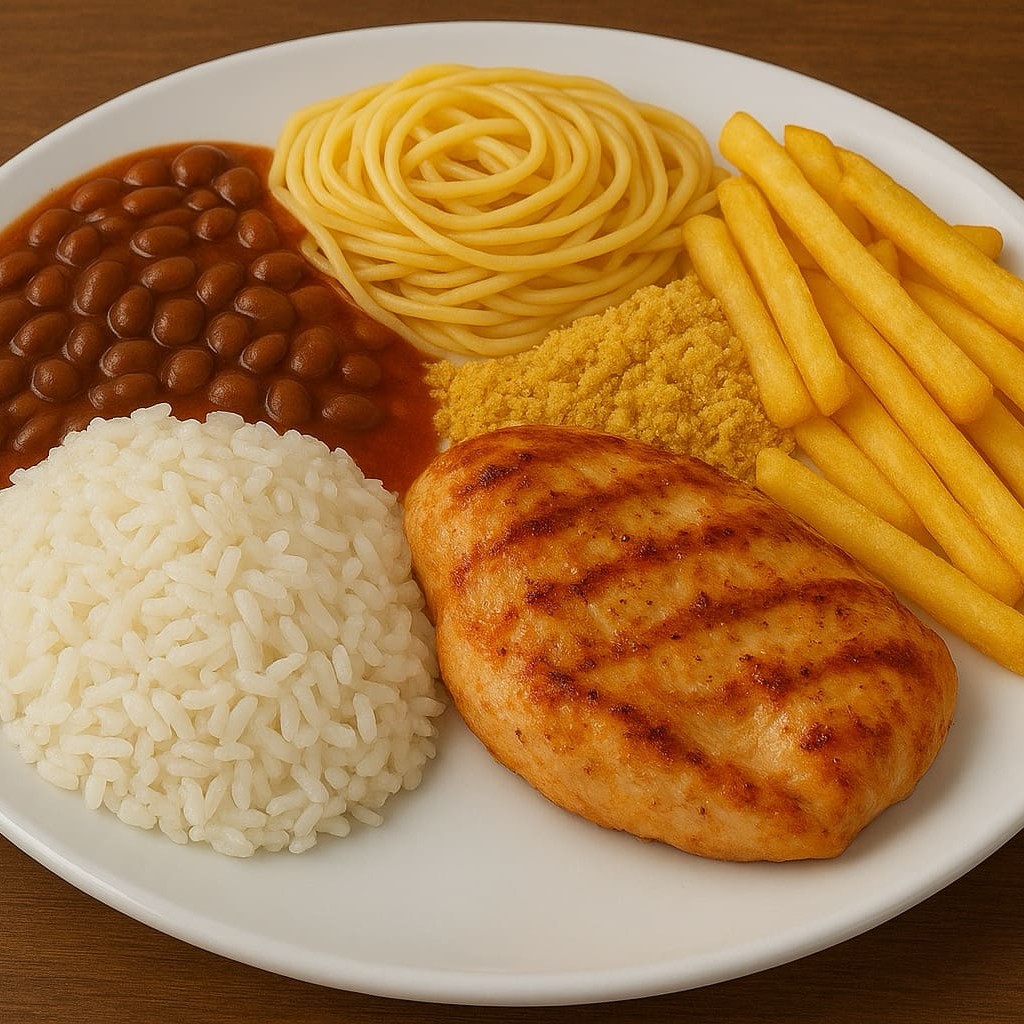 Arroz branco, feijão, batata frita, espaguete à bolonhesa, farofa e filé de frango grelhado.
