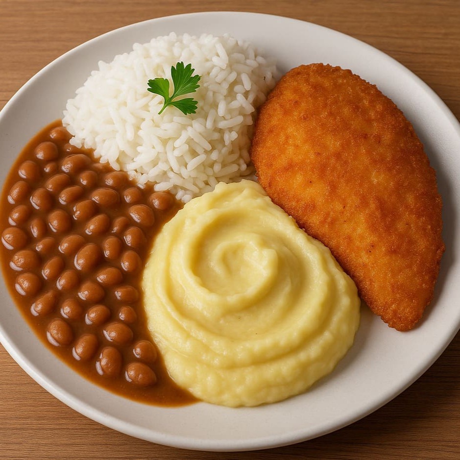 Arroz branco, feijão, farofa, maionese de batata e uma carne opcional