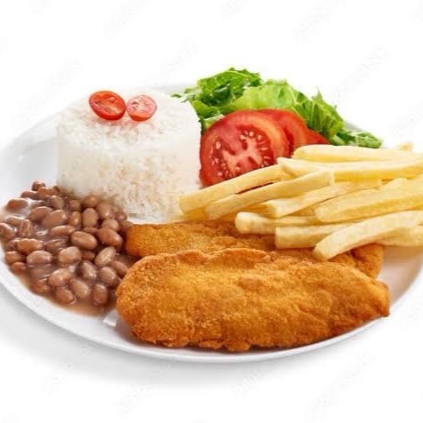 Arroz branco, feijão, batata frita bife de frango empanado salada separada de alface e tomate