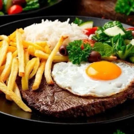 Contra filé acebolado + ovo frito, acompanha arroz branco, feijão, batata frita, salada separada ( alface tomate ).