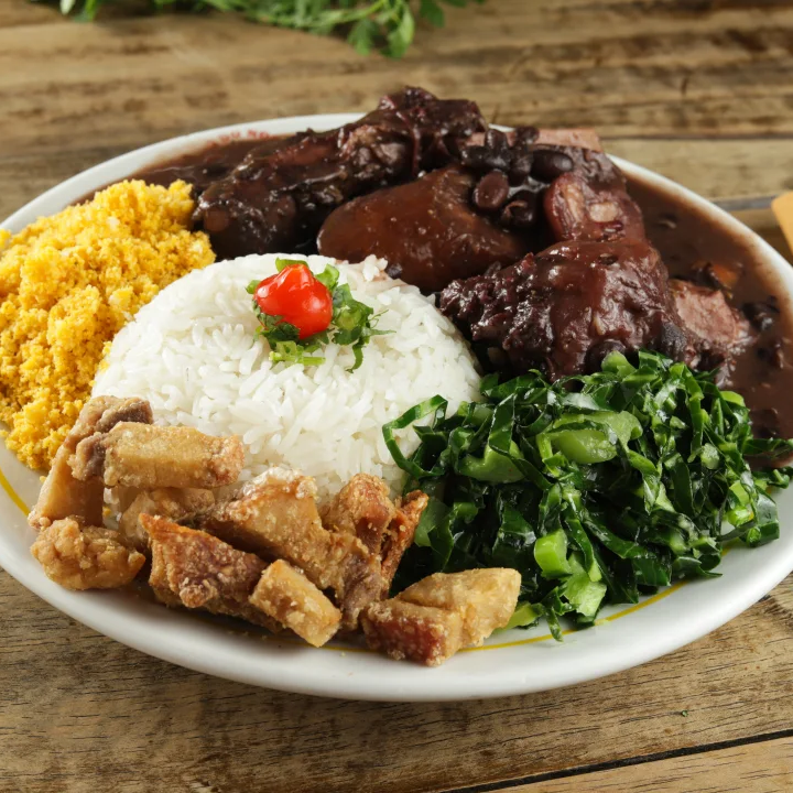 Arroz branco, feijão preto, farofa, couve e uma carne opcional