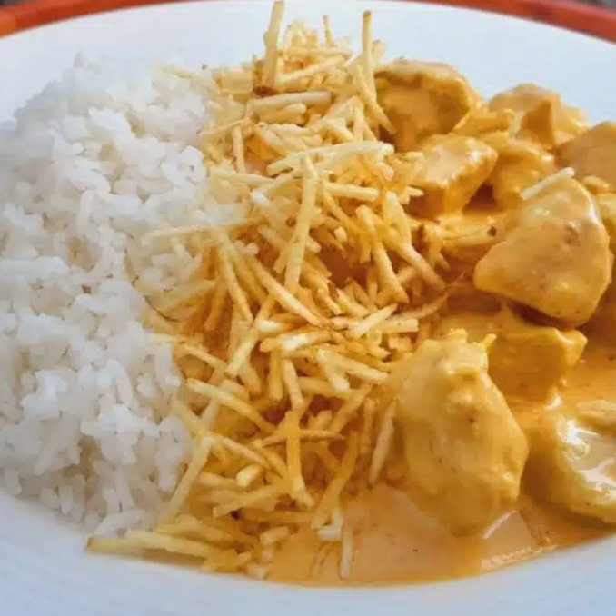 Arroz branco, estrogonofe de frango e batata palha