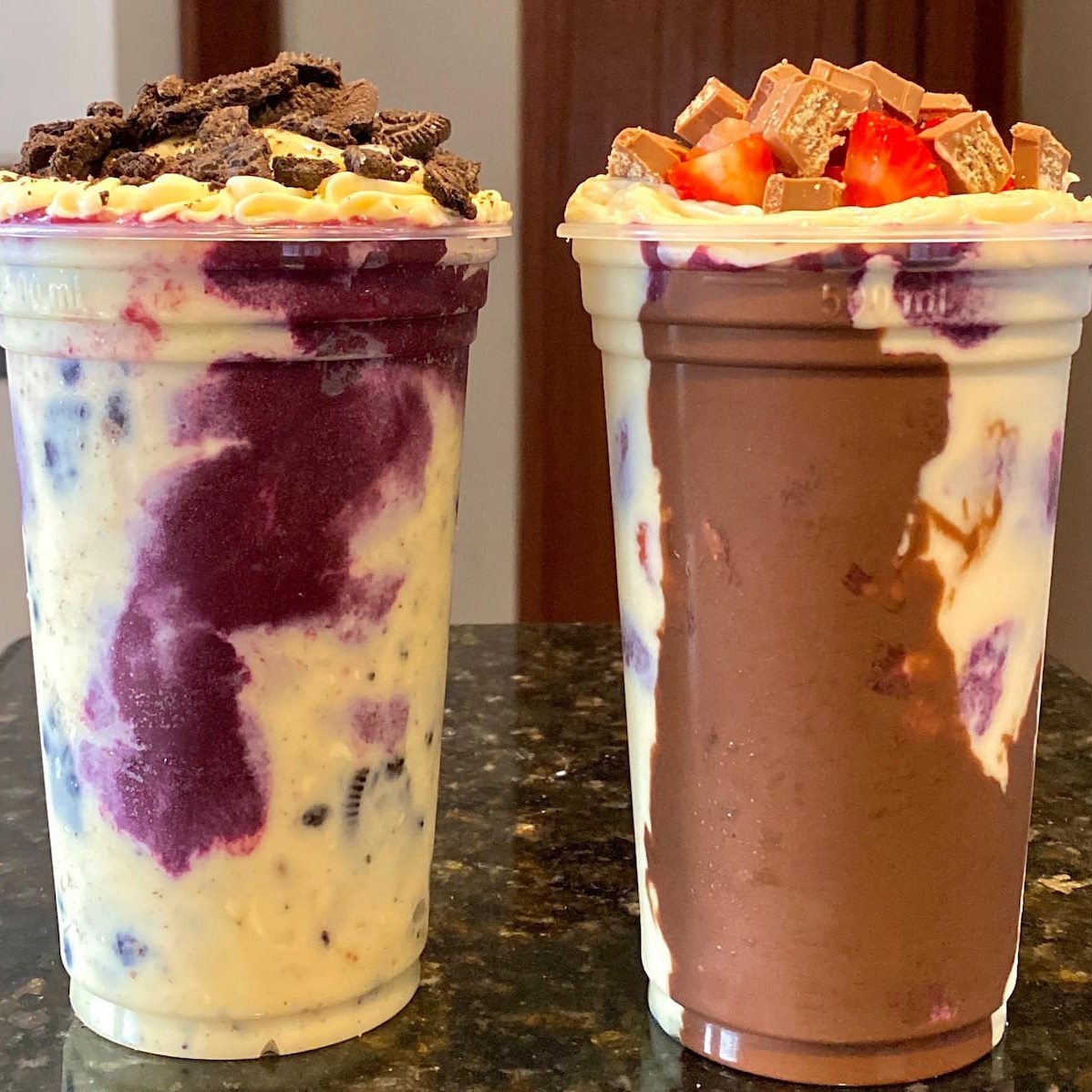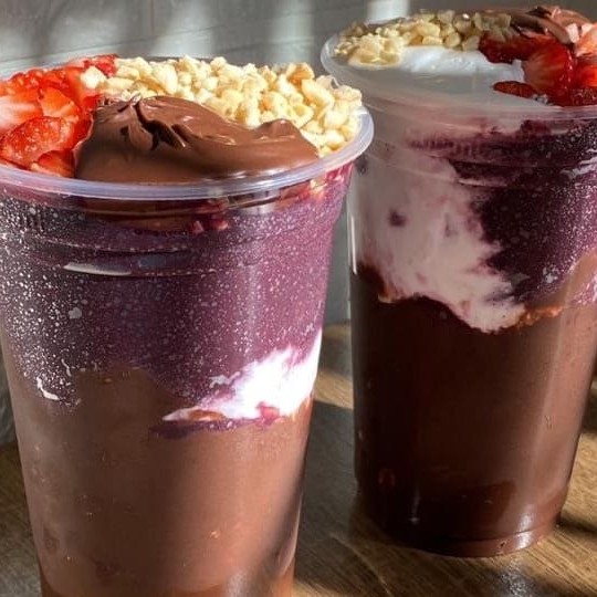 2 Copos De Creme De Açaí 700 Ml + 4 Acréscimos Junto No Copo
