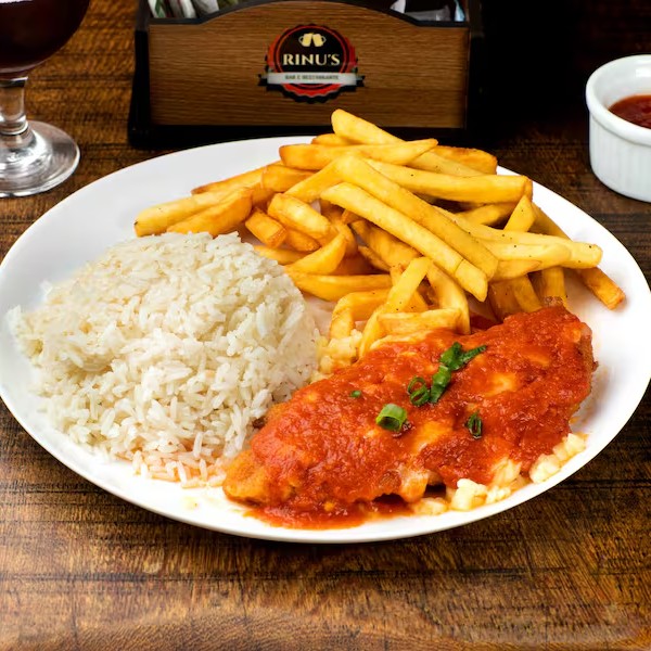 Arroz Branco, Fritas ou Purê de Batatas e Bife de Frango à Parmegiana.