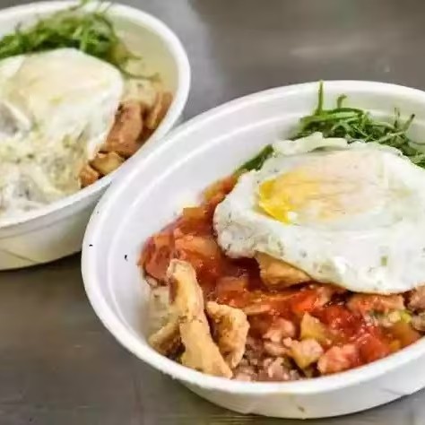 Arroz Branco, Feijão Comum, Bife de Frango, Batata Frita e Salada do Dia.
