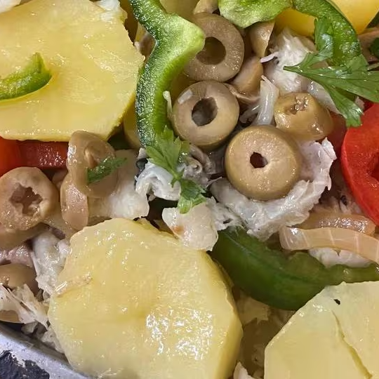 Arroz Branco, Delicioso Bacalhau com Batatas e Salada.
