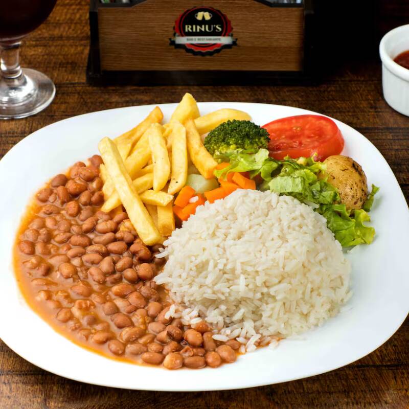 Arroz Branco, Feijão Comum, Bife de Boi, Batata Frita ou Purê de Batatas e Salada do Dia.