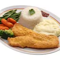 Arroz Branco, Purê de Batatas, Salada do Dia e Deliciosa Tilápia Empanada.