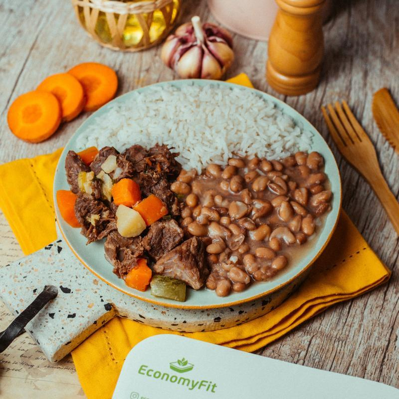 1 Marmitex Grande de Arroz + 1 Marmitex de Feijão Comum ou Feijão Tropeiro (conforme disponibilidade) + 1 Marmitex de Guarnição à sua escolha + 1 Marmitex de Salada + Aproximadamente 650g de Carne à sua escolha + Refrigerante 2 Litros.