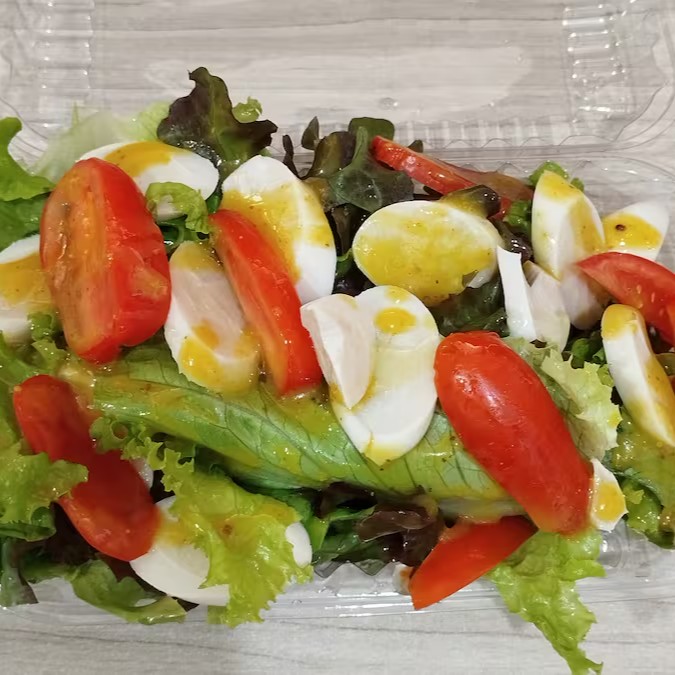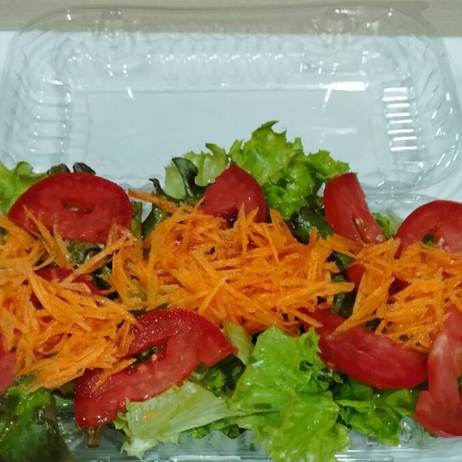 Deliciosa salada de mix de folhas , palmito, Tomate grape e molho de mostarda e mel.