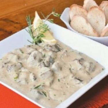 Filé mignon delicioso em cubos ao molho gorgonzola de 300 g, que acompanha torradas.