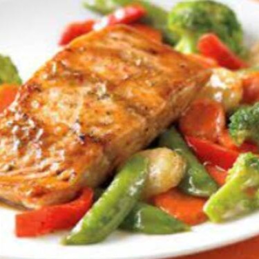 Prato delicioso que contém filé de salmão de 200 g, servido com legumes na manteiga e arroz branco.