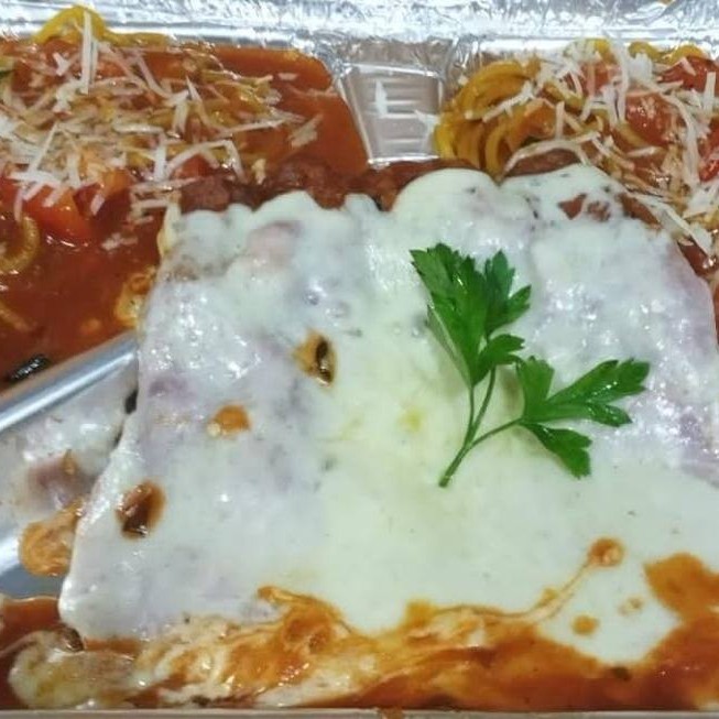 Prato delicioso que contém filé mignon a parmegiana de 200 g servido com espaguete ao molho de tomate fresco e manjericão.