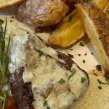 Prato delicioso que contém filé mignon 3 medalhas de 200 g, ao molho de gorgonzola servido com arroz branco e batata rústica polvilhada com parmesão.