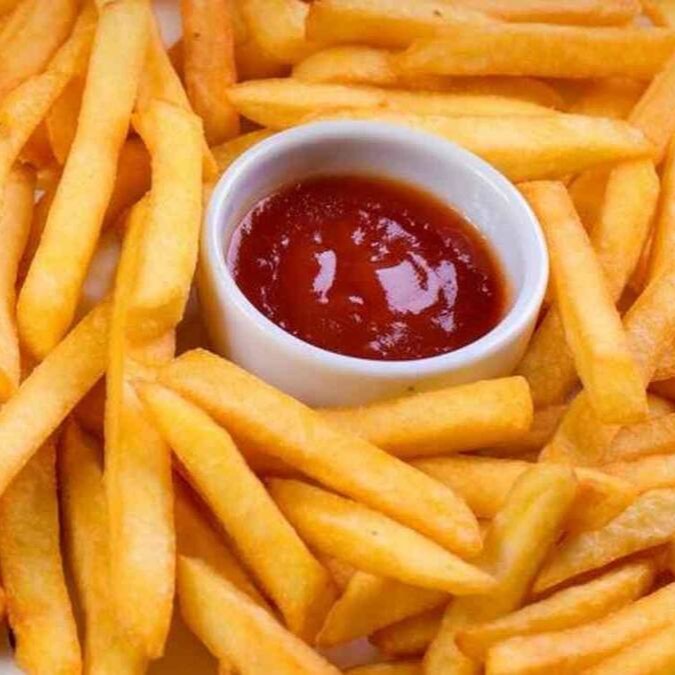 Deliciosas iscas de filé mignon acebolado de 300 g, com 300 g de batata frita.