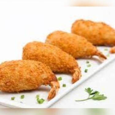Camarão frito empanado 5 unidades médios servido com risoto de tomate fresco e manjericão