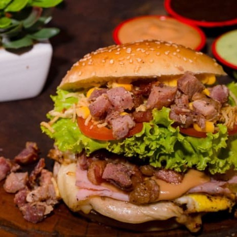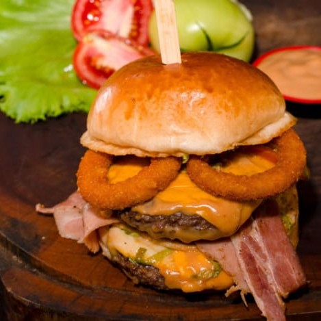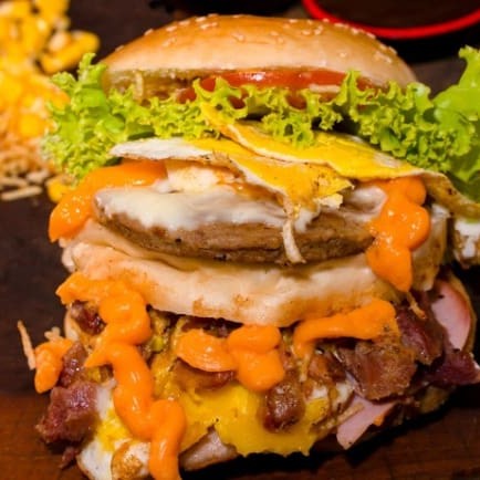 Pão brioche, 2 blends artesanais bovinos 130g cada, ovo frito, fatias de bacon, cheddar derretido, 2 anéis de cebola, alface, tomate e molho especial da casa.