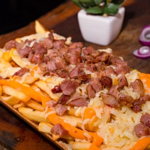 Porção generosa de batata frita, acompanhada de queijo derretido, bacon crocante e cheddar cremoso