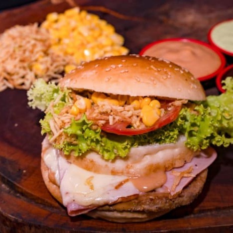Pão, Carne de Hambúrguer, 2 fatias de presunto, muçarela, milho, batata palha, alface, tomate, barbecue, maionese e molho especial
