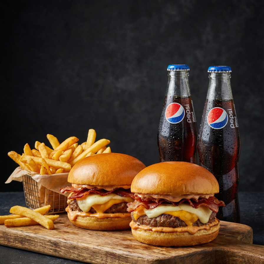 Cada hambúrguer é feito com pão macio, 1 blends de 130g, bacon crocante, mussarela derretida, cheddar, alface fresquinha, molho barbecue e o nosso molho especial da casa. Acompanha uma porção de batata frita 100gm e 2 PEPS 200ml