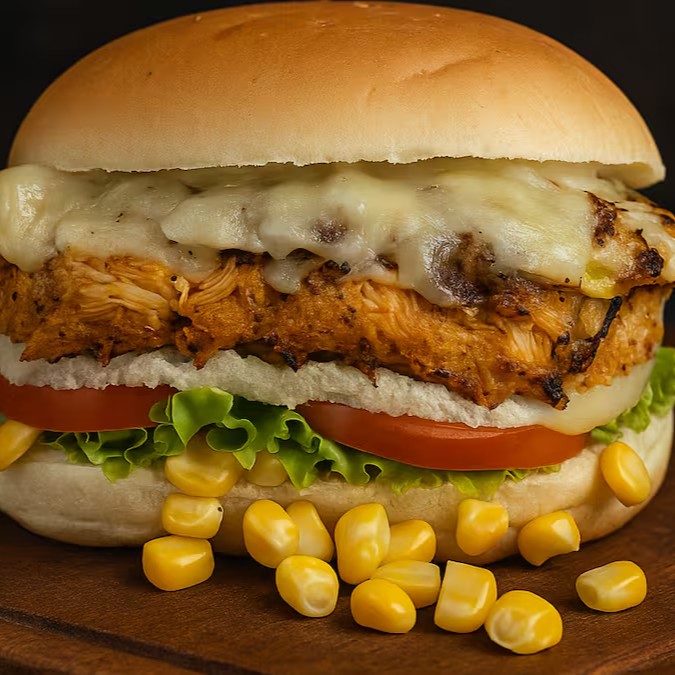 Pão, frango desfiado, bacon, ovo, mussarela, creme de maionese, milho verde, alface e tomate