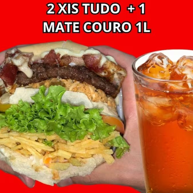 Dois X-Tudo caprichados, com hambúrguer artesanal, frango desfiado, queijo derretido, bacon crocante, presunto, ovo, alface, tomate, batata palha e aquela maionese caseira que faz toda a diferença. Para acompanhar, um Mate Couro de 1 litro bem gelado para matar a sede com estilo. Combinação perfeita para quem gosta de lanche completo e saboroso!