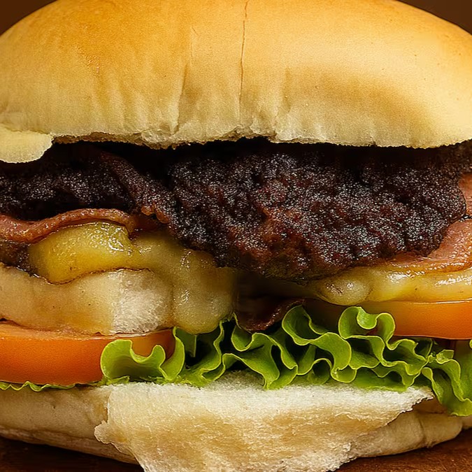 Pão, carne de hambúrguer, bacon, mussarela, alface, tomate e batata palha