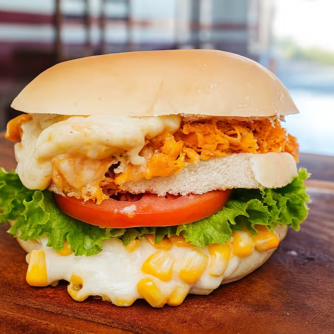 Pão, frango desfiado, Catupiry, creme de maionese, alface, tomate e milho verde
