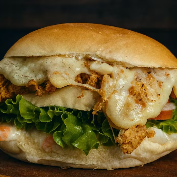 Pão, frango desfiado, mussarela, alface, tomate e maionese caseira( legumes)