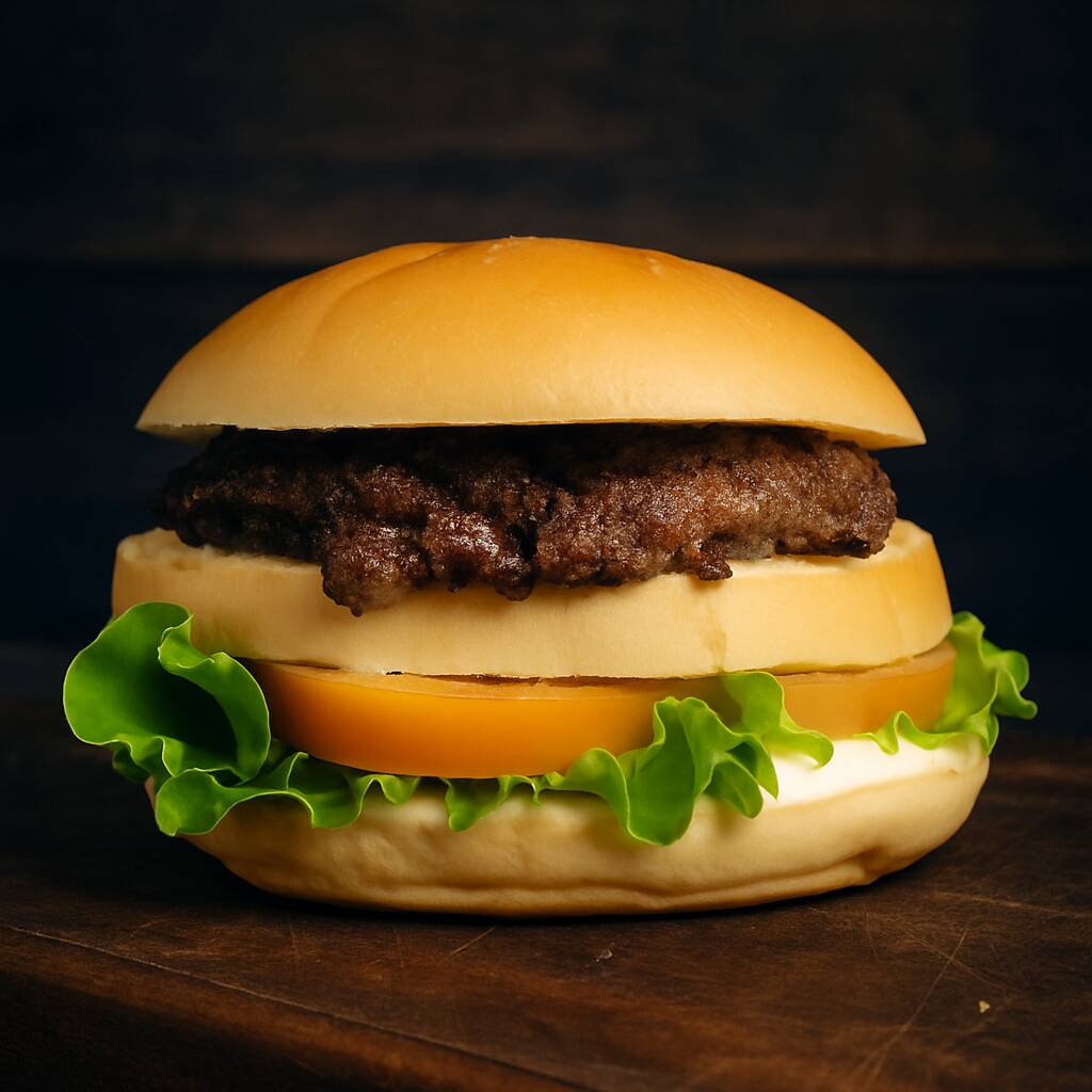 Pão, carne de hambúrguer, alface, tomate, creme de maionese e batata palha