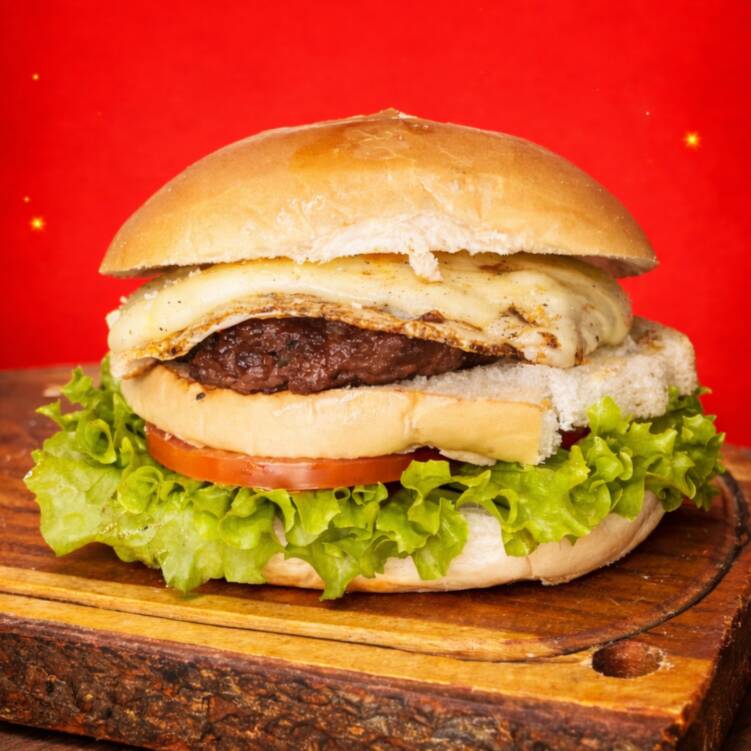Pão, carne de hambúrguer, mussarela, ovo frito, alface, tomate e batata palha