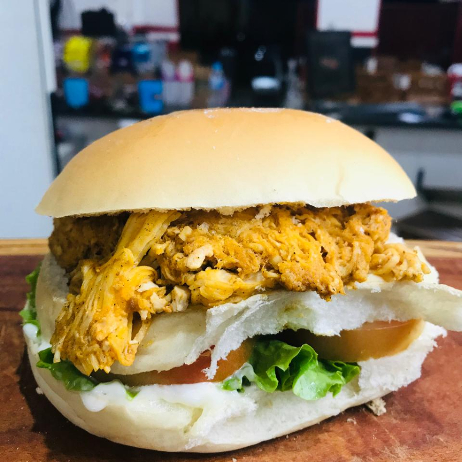 Pão, frango desfiado, alface, tomate, creme de maionese e batata palha