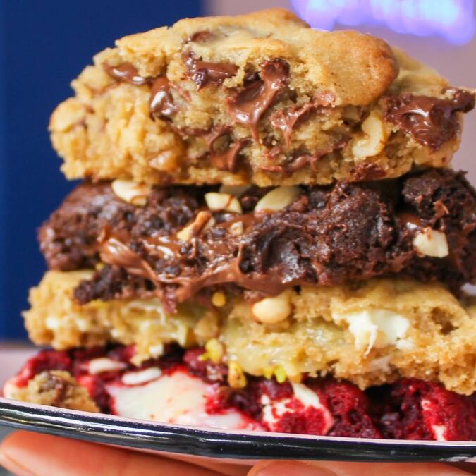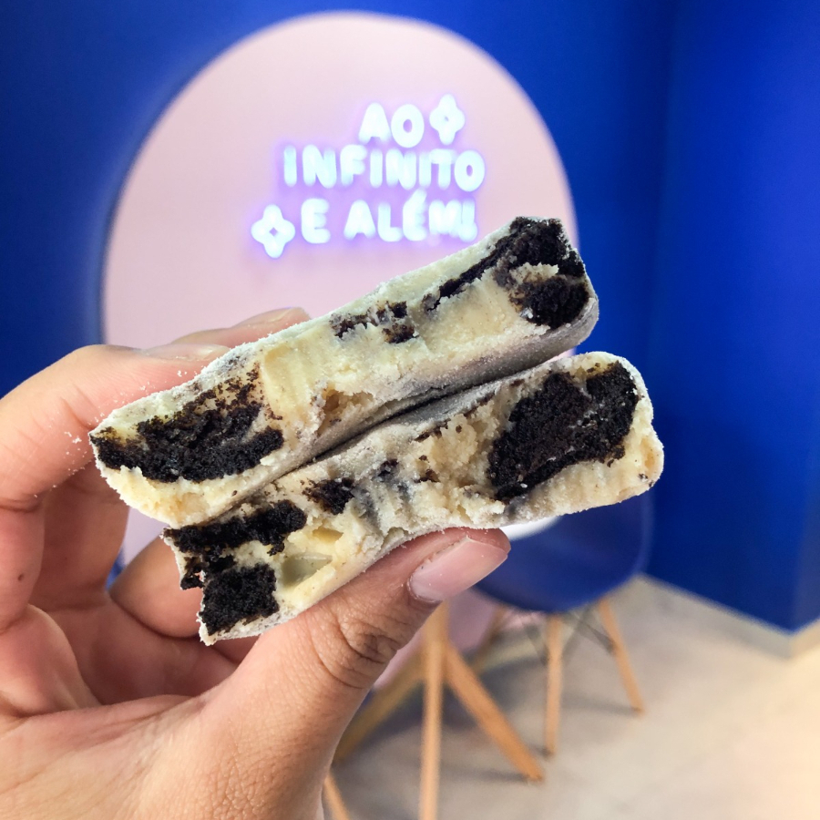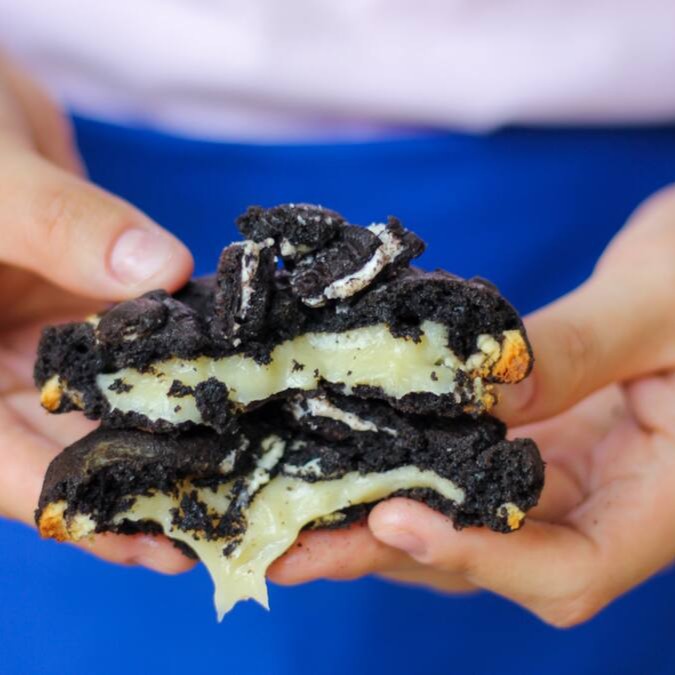 Cookie estilo New York com massa de cacau black, gotas de chocolate branco e recheio de brigadeiro de chocolate branco com pedacinhos de Oreo.
