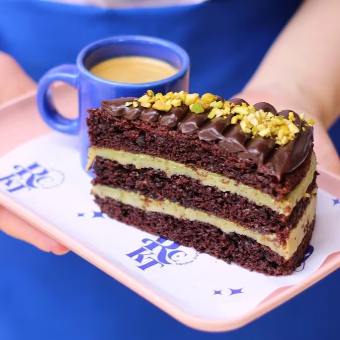 Bolo de chocolate molhadinho recheado com brigadeiro de pistache e creme de pistache com chocolate branco, coberto com creme de chocolate e pedacinhos de pistache puro.