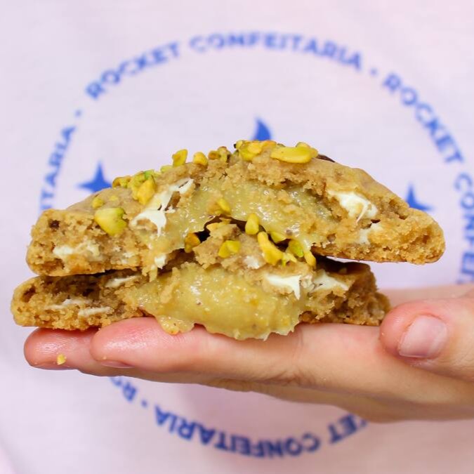 Cookie estilo NY com gotas de chocolate branco, recheado com nosso brigadeiro de pistache e pistaches torrados no topo.