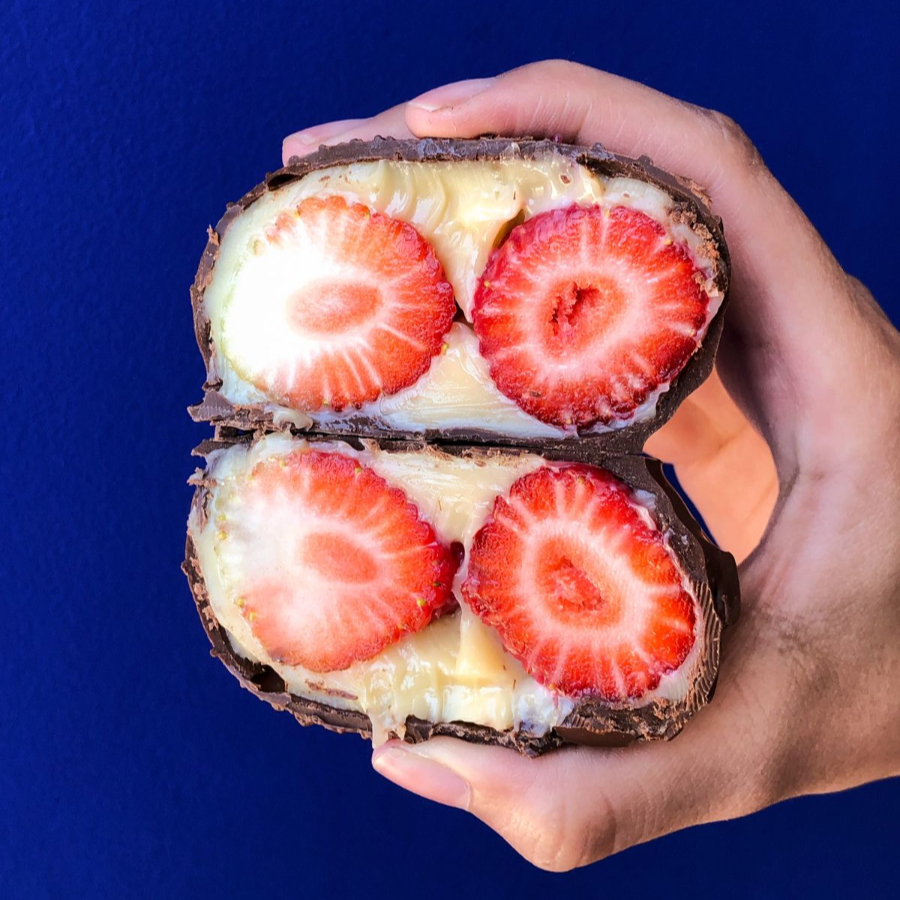 Bombom de Morango de 90g (menor que bombomzão) coberto com brigadeiro branco e casquinha de chocolate nobre.