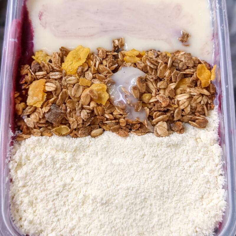 Açai,Leite em pó, Leite condensado,Granola.Observação: Você recebe cada complemento separadamente para combinar dentro do pote de açaí dentro de sua casa,criando sua própria experiência.