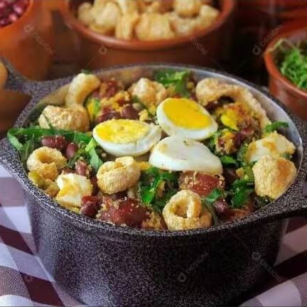 Nosso delicioso feijão tropeiro acompanha carne de porco em cubos, arroz branco soltinho, couve refogada