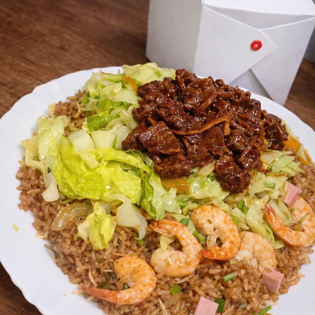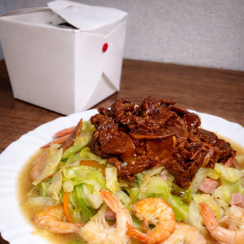 Delicioso Chop Suey com suculenta carne bovina, camarões frescos e cubos de presunto, tudo sobre uma cama crocante de legumes.