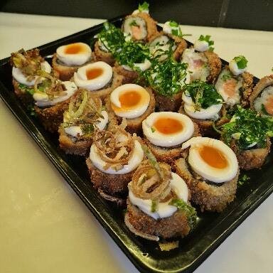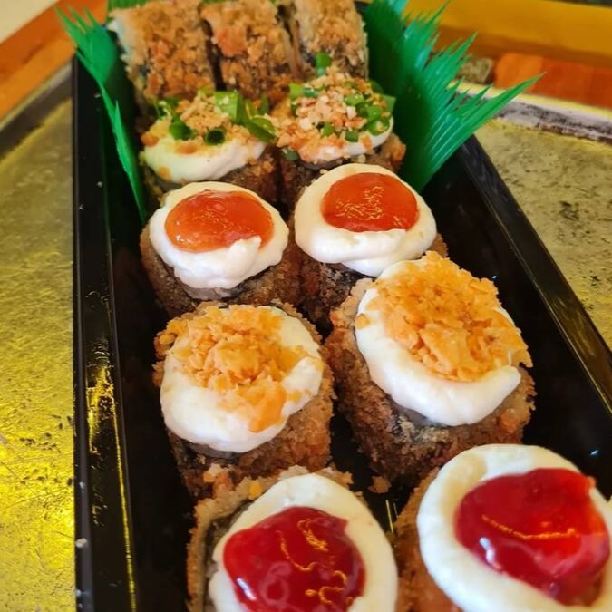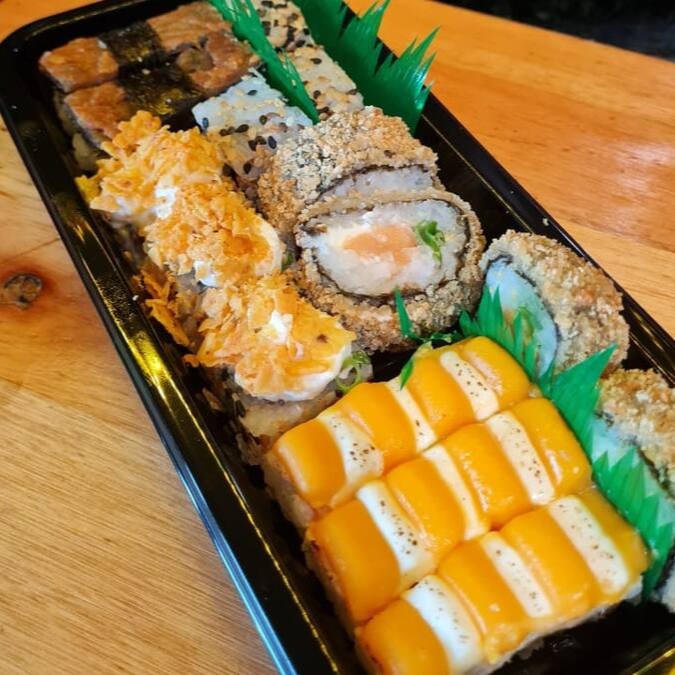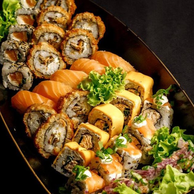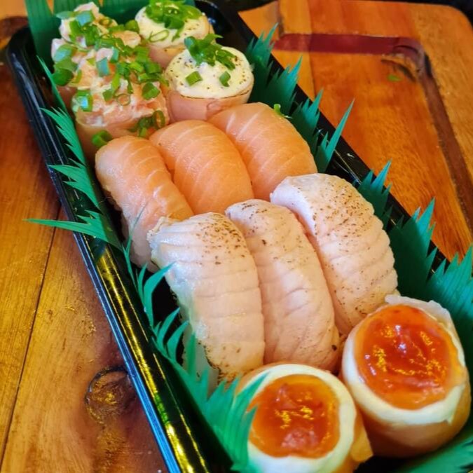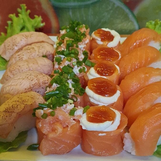5 unid salmão grelhado com geleia de pimenta 5 unid uramaki salmão grelhado com Doritos 5 unid maki pate salmão com tartar de salmao 5 unid Maki salmão grelhado pimenta biquinho 5 unid maki salmão grelhado com cheddar