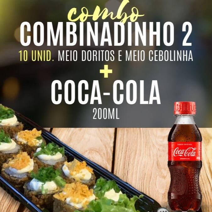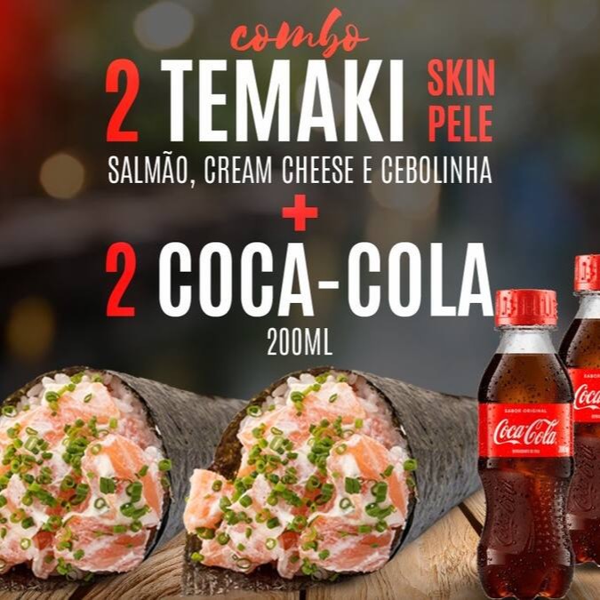 Promoção Imperdível: 2 Temaki Skin + 2 Coca-Cola 200 ml! Delicie-se com dois temakis recheados com pele de salmão crocante, combinados com o sabor refrescante de duas Coca-Colas geladinhas. Aproveite essa oferta especial e saboreie o melhor da gastronomia japonesa em um combo delicioso!