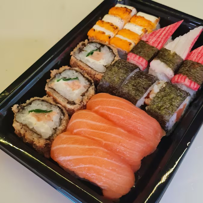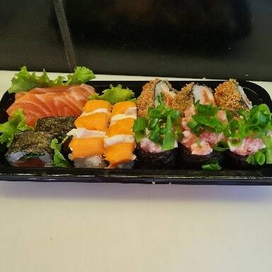 Delicie-se com o incrível Mini Combo (14 uni), uma combinação perfeita das mais saborosas e frescas peças de sushi. São 3 deliciosos Niguiri Salmão, 3 irresistíveis Hot Filadélfia, 3 suculentos Kani, 3 envolventes Maki Salmão e 2 irresistíveis Tortinhas de Salmão. Uma explosão de sabores que vai te surpreender!
